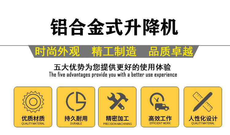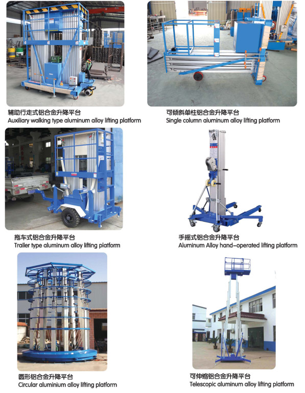 鋁合金式升降平臺(tái)采用高強(qiáng)度優(yōu)質(zhì)鋁合金材料,具有造型美觀,體積小,重量輕,升降平穩(wěn),安全可靠等優(yōu)點(diǎn).